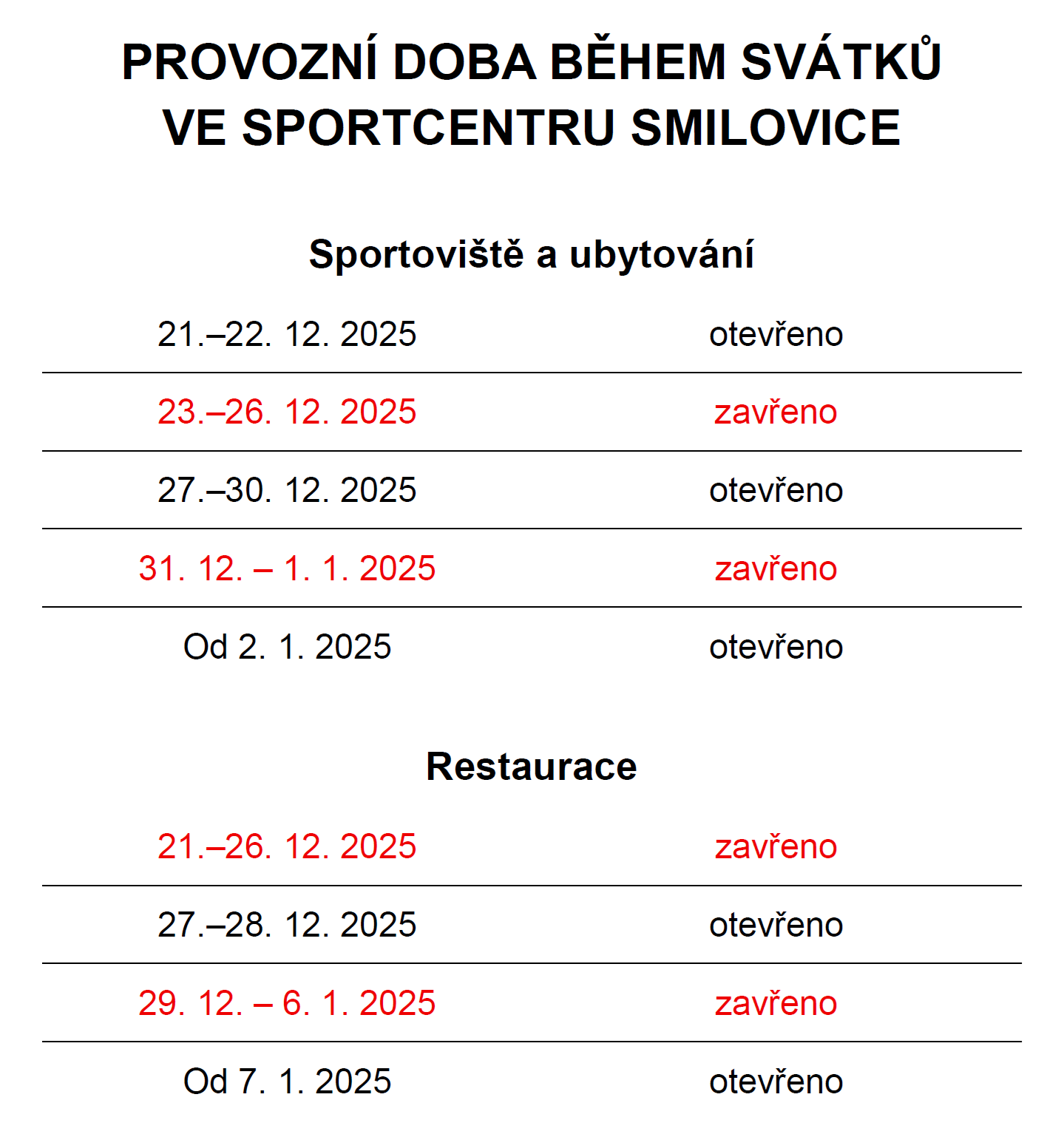 - Od 9. 9. 2024 došlo ke změně provozní doby Restaurace Sportcentra viz ZDE.