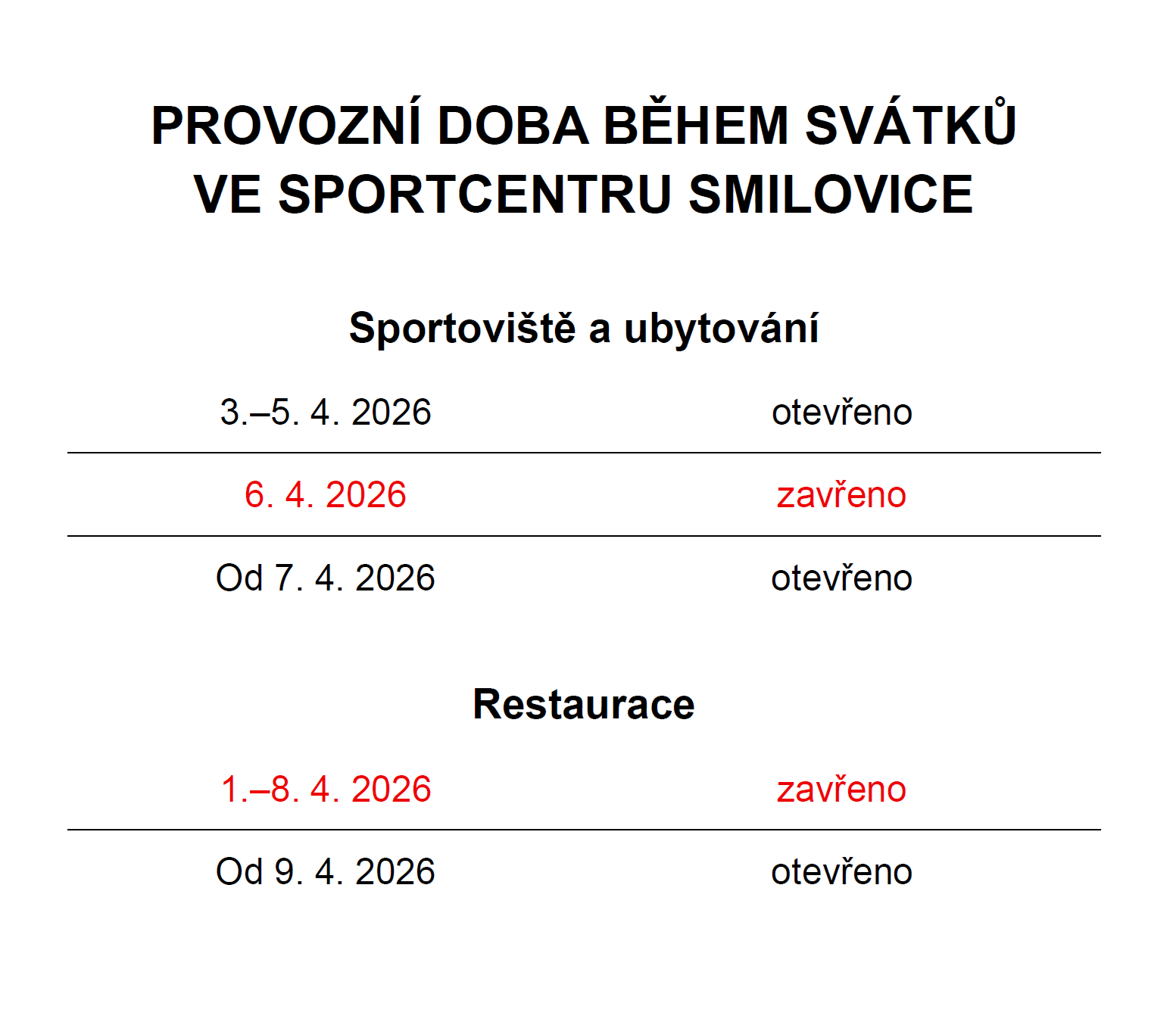 - Od 19. 5. 2025 došlo k aktualizaci ceníku služeb Sportcentra Smilovice, p.o. viz ZDE.